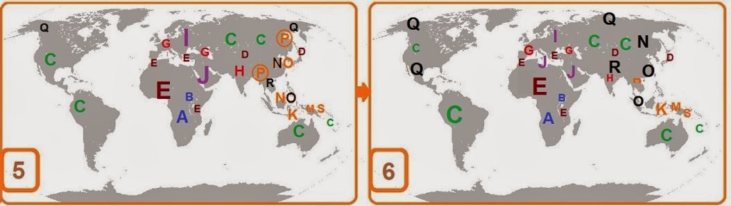 O Quadro 6 pretende apenas tornar clara a situação de evolução da migração/conquista com a entrada dos indo-europeus R na Índia, antes da sua migração para a Europa. Na zona europeia colocámos nestes quadros uma presença menos dominante dos G, já que há maior vestígio dos I e J