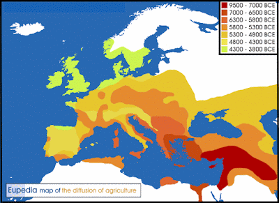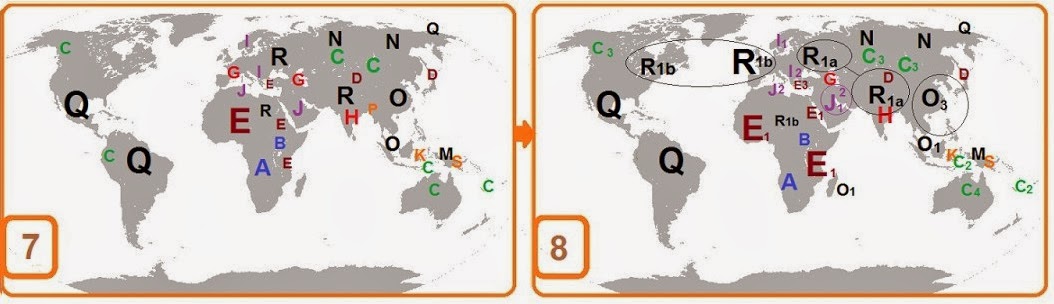 Da mesma raiz oceânica, os Q ficam dominantes na América, e os indo-europeus R iniciam a invasão europeia, provocando uma divisão dos I numa parte escandinava (I1) e balcã (I2), o mesmo se passando com os R1a e R1b, por virtude diluviana que estabeleceria o continente europeu como ilha. Os G passam a residuais na Europa, remetidos à origem caucasiana. Os R1a manteriam a ligação indo-europeia, enquanto que os R1b definiriam uma civilização atlântica (ou atlante...). Este seria o panorama à época diluviana, circa 9000 a.C. (ou bem menos...).